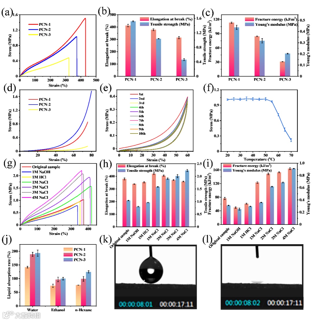 图3 (a) 拉伸应力-应变曲线及(b、c)Na3Cit浓度对湿海绵力学性能影响的相应力学性能参数;(d) 不同浓度Na3Cit作用下湿海绵的压缩应力-应变曲线;(e) PCN-2湿海绵的10个压缩循环;(f) 不同温度下PCN-2湿海绵在水中的拉伸应力-应变曲线;(g) 拉伸应力-应变曲线及(h, i)不同溶液浸泡24 h对湿海绵力学性能影响的相应力学性能参数;(j) 湿海绵对不同液体的吸收率;(k, l) 湿海绵接触角视频截图。