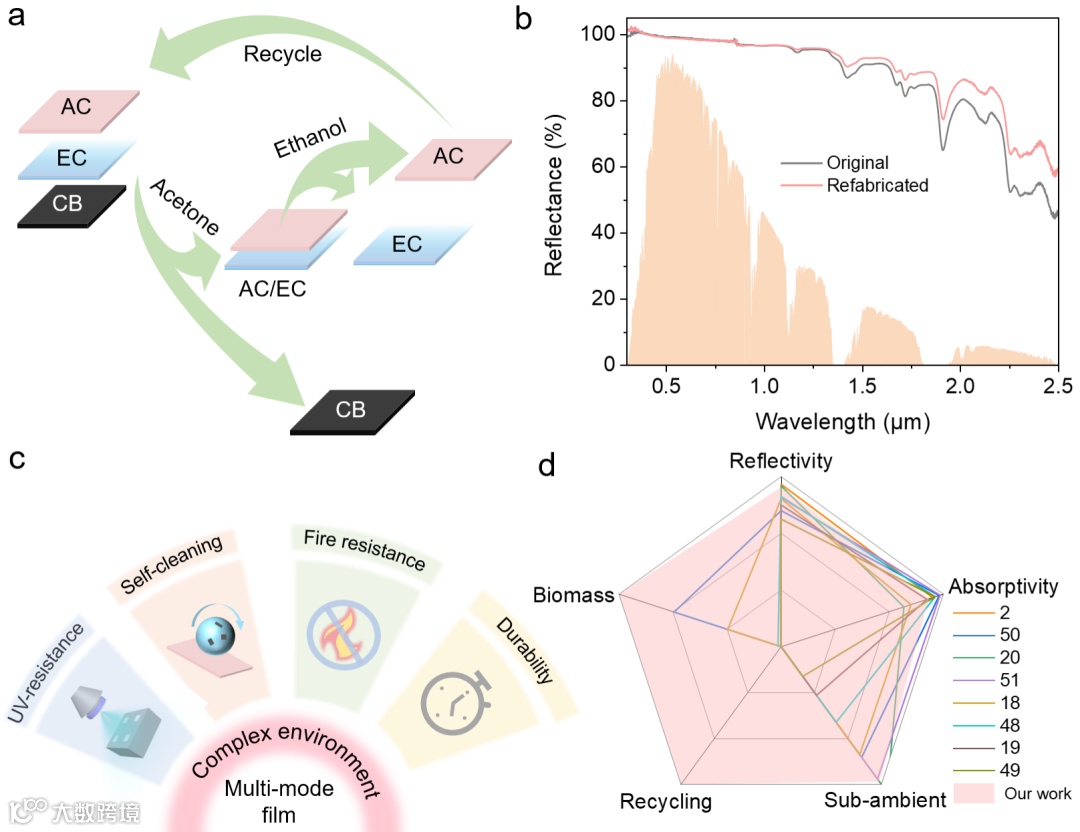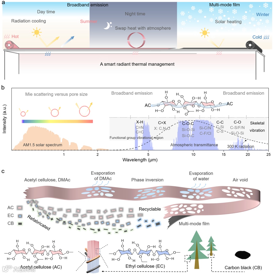 被动辐射制冷技术基于制冷材料向外界空间辐射热量,并通过大气窗口(8-13μm波段)将热量散发到外层空间,从而达到冷却效果。该技术有效地降低了对传统能源的依赖,从而减少了碳排放,在节能减排方面具有重要应用前景。随着环境挑战的日益严峻,确保辐射制冷材料可持续发展的同时,实现全天候(包括白天、夜晚以及夏季和冬季)的智能热管理变得愈加艰巨。