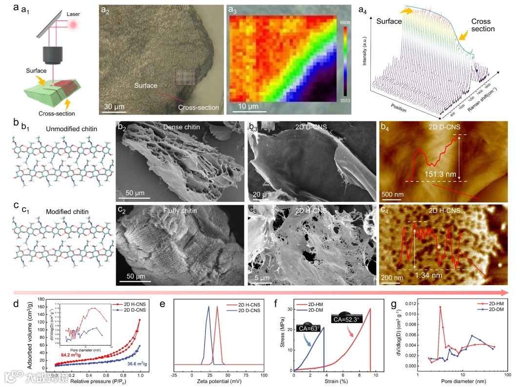 在这项工作中,2D H-CNS的制备涉及螃蟹壳粉碎纯化、脱乙酰预处理、盐酸蒸汽酸解和辅助超声处理。值得注意的是,脱乙酰预处理引入的表面电荷促进了甲壳素致密本征结构的疏松,增加了进一步结构剥离的可能性。将改性甲壳素(图1b2)转移到含有盐酸蒸汽的封闭反应器中,获得了由松散甲壳素片层和互连的微/纳米纤维构成的蓬松甲壳素(图1b3),再通过低功率超声处理,蓬松甲壳素即剥离为表面具有丰富的微纳米孔洞2D H-CNS(图1b4),其组装膜可用于渗透能收集。
