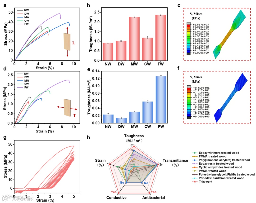 图3 (a-c)L方向FW的机械性能及有限元模拟。(d-f)T方向FW的机械性能及有限元模拟。(g)L方向FW的循环加载曲线。(h)FW与先前报道的功能化木材对比雷达图。