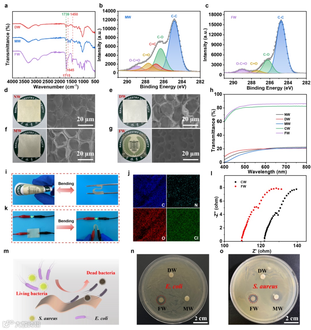图2 (a-h)FW具有优异的光学透光率。(i-l)FW具有优异的柔韧性和高导电性。(m-o)FW具有优异的抑菌性。