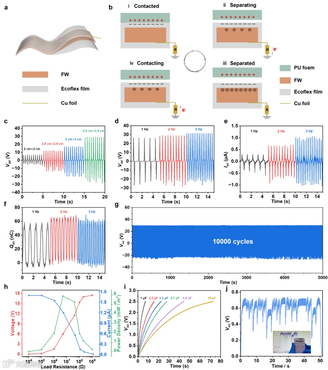 图4 (a)FW-TENG的结构示意图。(b)FW-TENG的工作原理图。(c-j)FW-TENG的电输出性能。
