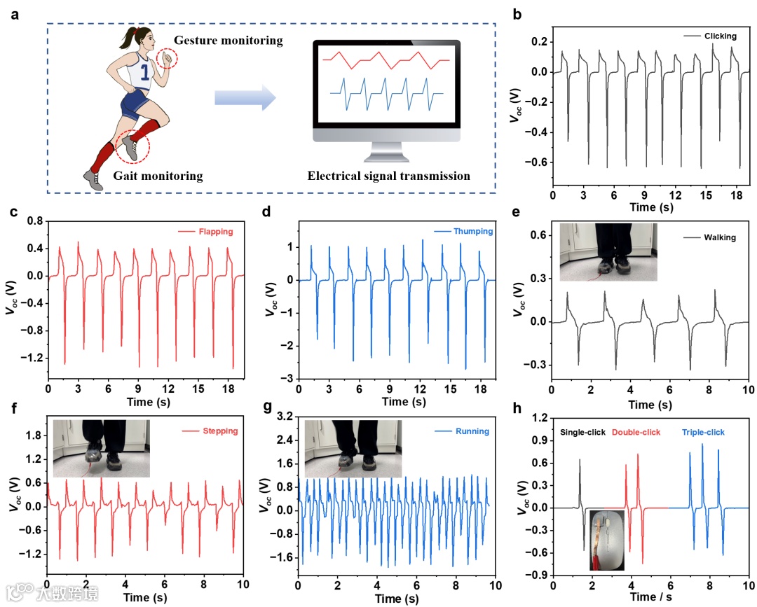 FW-TENG柔性压力传感器可用于监测人体运动,如识别不同手势:点击、拍打、锤击,不同运动状态:走路、踏步、跑步等。