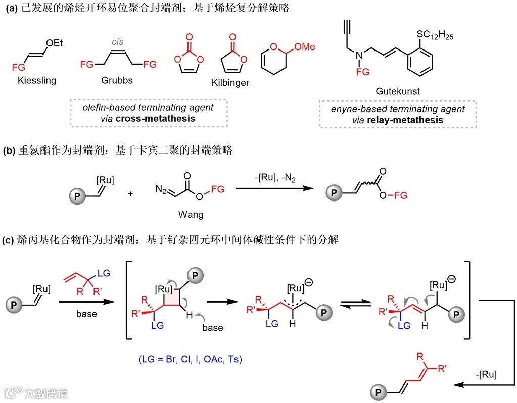 开环易位聚合反应的核心在于金属卡宾和烯烃的[2+2]反应生成金属杂四元环中间体,以及后续的逆[2+2]反应。其中Grubbs类型的钌卡宾因为具有反应条件温和、官能团兼容性好,且可精确控制聚合产物的分子量、分子量分布及拓扑结构等的优势,成为开环易位聚合中常用的一类催化剂。另一方面,开环易位聚合反应结束后产物链末端活性金属中心的淬灭,并同时引入功能基团,即所谓聚合物的封端,对产物的实际应用具有非常重要的意义。据此,人们已经发展了一系列封端的方法(图 1a)。然而,大部分已发展的方法从原理上均是基于烯烃复分解或串联复分解反应,往往存在以下的局限:1)反应时间长,封端剂用量大;2)由于反应后生成的仍然是钌卡宾物种,故难以被完全淬灭;3)封端剂的合成通常比较复杂。