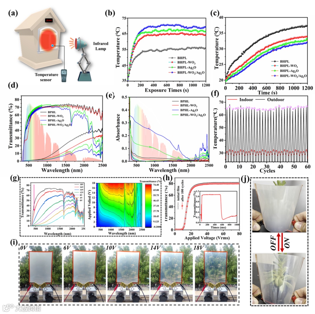 Figure 4. (a) the schematic diagram of thermal insulation test device (b)-(c) The surface temperature of the film glass and the interior air temperature of the box rising curves with irradiation time; (d) The vis-NIR transmittance (Ton and Toff) and the (e) absorption spectra of the film with different NPs; (f) Thermal insulation stability test of 0.5BHPL-WO3/Ag2O film glass.(g) The transmittance spectra of PDLC were assessed at varying voltage levels.; (h) the Electro-optical curves of the original film and the film after 100 cycles (the response time curves is shown in the insert illustration); (i) photos of PDLC window; (j) the flexible form of PDLC smart window;