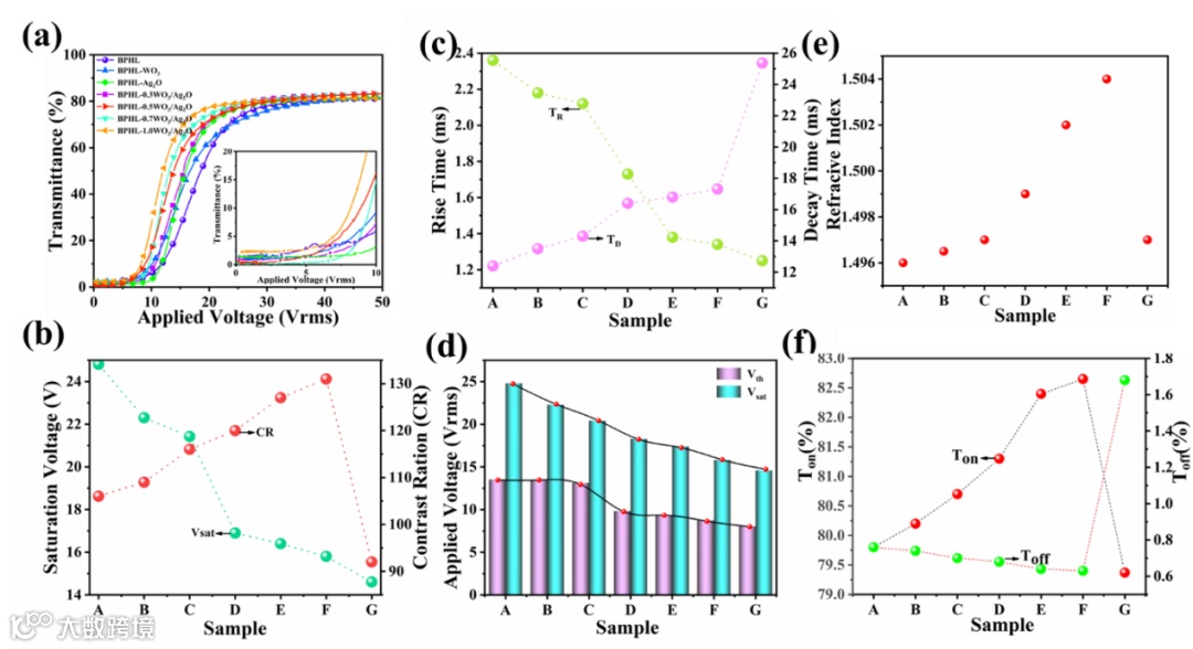 Figure 3. (a) The transmittance curve with voltage; (b) saturation voltage (Vsat) and contrast ratio (CR); (c) the rise time (TR) and decay time (TD) of samples A-G; (d) Vth and Vsat cruves; (e) refractive indices of different samples; (f) Variation curves of Ton and Toff for samples;