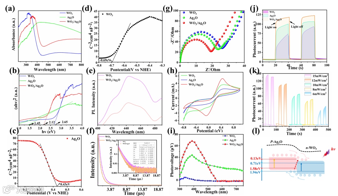Figure 2. UV–Vis DRS (a) and plots of (ahv)2 versus photon energy (hv) (b) of WO3, Ag2O, WO3/Ag2O; the Mott-Schottky plots of (c) WO3 and (d) Ag2O; PL spectra of WO3 and WO3/Ag2O at the excitation wavelength of 365 nm (e); (f) the fluorescence life curve of WO3 and WO3/Ag2O; EIS Nyquist plots at 0.1V bias potential vs (g), Cyclic voltametric curve (h), and the surface photoelectric voltage (i) of WO3, Ag2O and WO3/Ag2O; the periodic on/off photocurrent response WO3, Ag2O and WO3/Ag2O (j) and photocurrent value of at the different light intensities (k); Schematic representation of electron transfer in p-n heterostructures (l);