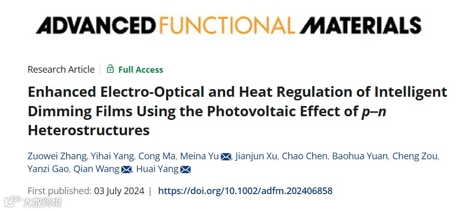 北京科技大学杨槐/于美娜团队等人开发设计了一种低电压高对比度具有被动辐射制冷功能的智能窗户,通过在聚合物基质中引入纳米粒子,利用其良好的光电效应大大提升薄膜的电光性能,增加了聚合物基底的散射中心,对比度得到了很好的提升。同时通过分子设计,引入了具有红外发射能力的可聚合单体,使得薄膜同时实现了被动辐射制冷和太阳光的调制。相关工作以“Enhanced Electro-Optical and Heat Regulation of Intelligent Dimming Films Using the Photovoltaic Effect of p–n Heterostructures”为题发表于Advanced Functional Materials,北京科技大学/北京大学杨槐教授、于美娜副研究员、王茜特聘副研究员为共同通讯作者,北京科技大学新材料技术研究院博士生张作为为文章第一作者。