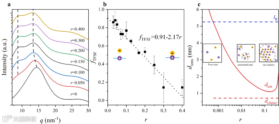 图3. (a) PS-PPEGMEA/LiTFSI的广角X射线散射曲线。(b) PS-PPEGMEA/LiTFSI中自由TFSI-阴离子浓度fTFSI-随盐浓度r的变化。(c)离子之间的特征尺寸与r的关系。