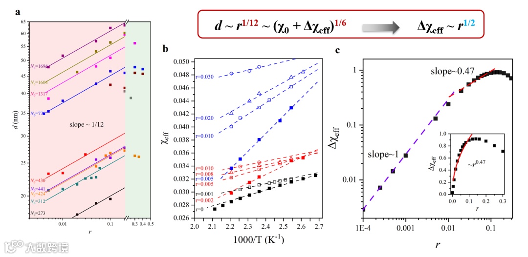 由于离子解离的影响,实验上同时发现(图4a):当r < 0.14时,微相分离形成的特征尺寸d与锂盐浓度r遵循特定的指数关系d ~ r1/12;当r > 0.14时,特征尺寸几乎不再增加,甚至略有减小。研究人员由此推断,离子的静电作用Δχeff与锂盐浓度r呈现1/2次方关系Δχeff ~ r1/2,并通过散射实验测量出静电作用确实符合此关系(图4b),进一步结合理论模型对静电作用做了定量解释。在实验测试范围中,理论模型预测的指数关系为0.47 ± 0.05(图4c),与实验结果非常接近。