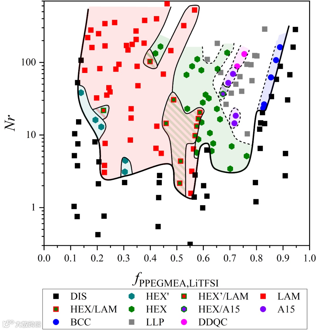 图2. LiTFSI掺杂的PS-PPEGMEA嵌段聚合物电解质的相图。粗实线描绘了有序-无序相转变(ODT)边界,细实线描绘了有序-有序相转变(OOT)边界,虚线描绘了动力学介稳态的区域。其中,DIS代表无序相;HEX’代表PPEGMEA柱状相;LAM代表层状相;HEX代表PS柱状相;BCC代表体心立方球状相;A15,σ,以及DDQC代表复杂球状相;LLP代表类液态堆积相。
