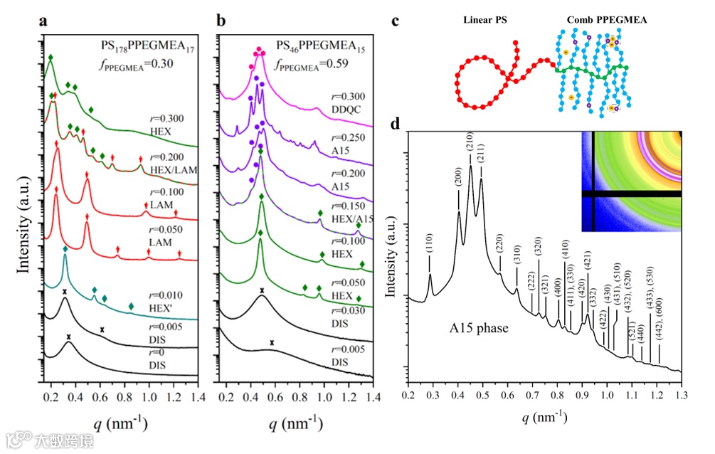 研究人员首先使用小角X射线散射表征了样品的微相分离结构(图1),发现少量离子就可以促使样品从无序相进入有序相(ODT);随着离子浓度增高,样品会进一步发生有序-有序相转变(OOT)。在特定条件下,样品中可以形成复杂的球状堆积相,如A15,σ,以及十二重准晶相(DDQC)等。