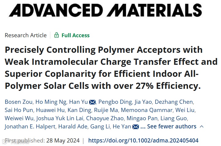 目前,随着物联网生态系统的迫切发展需求,室内光伏(IPVs)越来越受到学术界和工业界的关注。全聚合物太阳能电池(all-polymer solar cell,简称all-PSCs),作为有机光伏电池的一个分支,以其优异的成膜性能、形貌稳定性和光稳定性等优点,有望同时实现高效、稳定的IPV为室内电子产品供电。然而,高性能宽带隙聚合物受体的相对开发缓慢限制了室内全聚太阳能电池的发展。