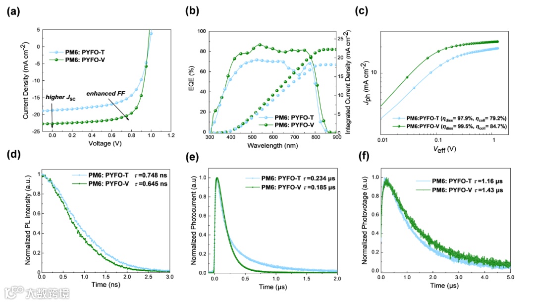 为了深入研究器件工作中的电荷转移过程,在680 nm光激发下对这两个分子的纯膜和混合膜进行了瞬态吸收光谱(TAS)分析。通过对比纯膜与混合膜我们发现,纯膜状态下,760 nm探测下,PYFO-V具有较长的光谱衰减时间,即较长的激子寿命。而在混合膜状态下,PM6:PYFO-V却表现出较快的760 nm 激子衰减寿命。由此可以得出结论:PYFO-V的共混膜具有更快的激子扩散和解离效率。因此,PM6:PYFO-V共混膜中更有效的电荷转移过程,非常好的解释了PM6:PYFO-V器件的性能缘由,与上述器件表征相契合。