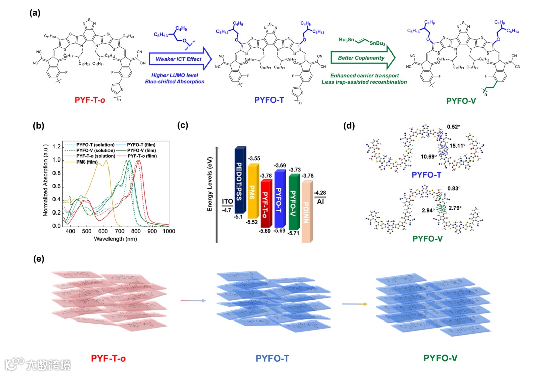 紫外可见光谱中(图1b),与PYF-T-o的最大吸收峰(808 nm)相比,烷氧链取代聚合物受体的最大吸收峰(λmax, sol)均呈现蓝移,这是由于烷氧链取代直链后,分子内电荷转移效应减弱。因此,与经典的PYF-T-o相比,两种新型聚合物受体的吸收光谱与室内光源有更高的重叠,有利于室内可见光的采集。循环伏安法(CV,图1c)结果表明:与PYF-T-o相比,PYFO-T和PYFO-V的带隙都变大了,这是由于烷氧链的给电子作用造成的。上升的LUMO能级有利于实现器件中提升的开路电压(VOC)。密度泛函理论(DFT)计算中,在烷氧基引入后,由于烷氧侧链上的氧原子与端基连接乙烯基上的氢原子之间的非共价相互作用,二者在该区域形成了构象锁定,提高了高分子的平面度和构象刚性。对于PYFO-T和PYFO-V的堆积结构,如图1d所示,PYFO-V的末端基团与连接基元之间的二面角比PYFO-T小得多,有利于聚合物链内共面性和共轭程度的提高,从而增强分子的结晶性,更有利于电荷运输。