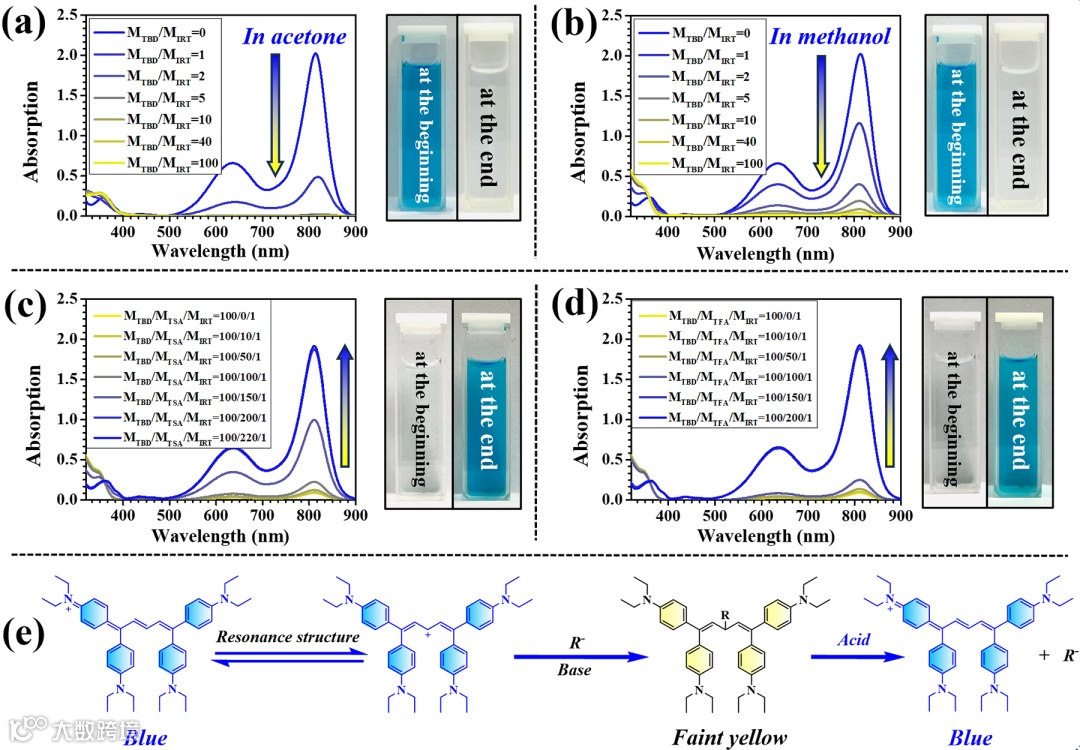 图3 不同摩尔比的TBD与IRT的(a)丙酮和(b)甲醇溶液的UV-vis-NIR吸收谱图(IRT的浓度保持在1 × 10−5 mol L−1);不同摩尔比的(c)TBD/TSA/IRT和(d)TBD/TFA/IRT的(a)丙酮和(b)甲醇溶液的UV-vis-NIR吸收谱图(IRT的浓度保持在1 × 10−5 mol L−1);(e)IRT酸碱变色的机理