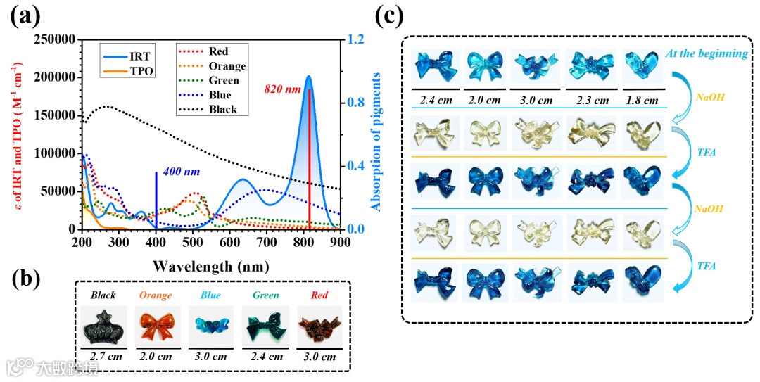 通过传统的紫外或可见光聚合方式制备有色聚合具有一定的困难,因为有色填料例如颜料与光引发剂存在光吸收竞争关系从而阻碍光聚合,而近红外光聚合则是制备有色聚合物的有效方法之一,因为大部分的有色填料在近红外光区吸收较弱。图4a为IRT、商用的引发剂(2,4,6-三甲基苯甲酰基)二苯基氧化膦(TPO)与不同颜色填料的UV-vis-NIR吸收光谱,可以看出IRT在近红外光区的吸收远远大于填料,而TPO在近紫外区则难以与填料竞争。如图4b所示,基于IRT的聚合体系无论填料的颜色如何均可以制备出聚合物,尤其是黑色聚合物,说明了使用近红外光聚合制备有色聚合物的可行性;而基于TPO的近紫外光聚合体系则难以聚合。图4c为基于IRT的近红外光聚合体系所制备的酸碱变色聚合物的示意图,当聚合物通过NaOH或TFA溶液浸泡后,会呈现处不同的颜色,从而实现通过酸碱性调控聚合物颜色的性质。