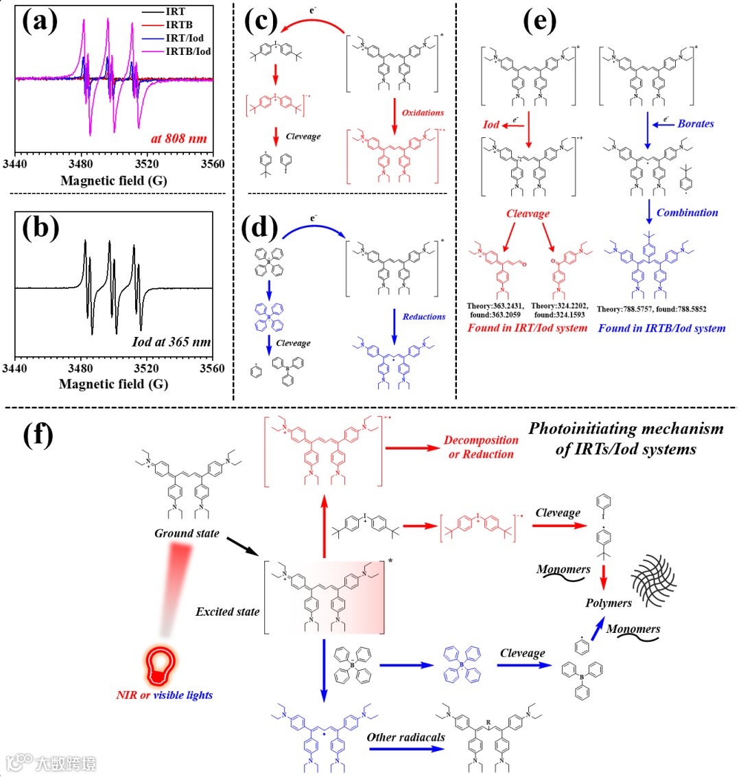 图2(a)IRTs与IRTs/Iod在808 nm近红外光源照射下生成自由基的ESR信号图;(b)Iod在365 nm光源照射下生成自由基的ESR信号图;(c)IRT正离子与Iod电子转移的机制;(d)IRT正离子与四苯基硼酸根电子转移的机制;(e)LC-MS所检测到的IRTs/Iod体系的光解产物;(f)IRTs/Iod体系的引发机制。