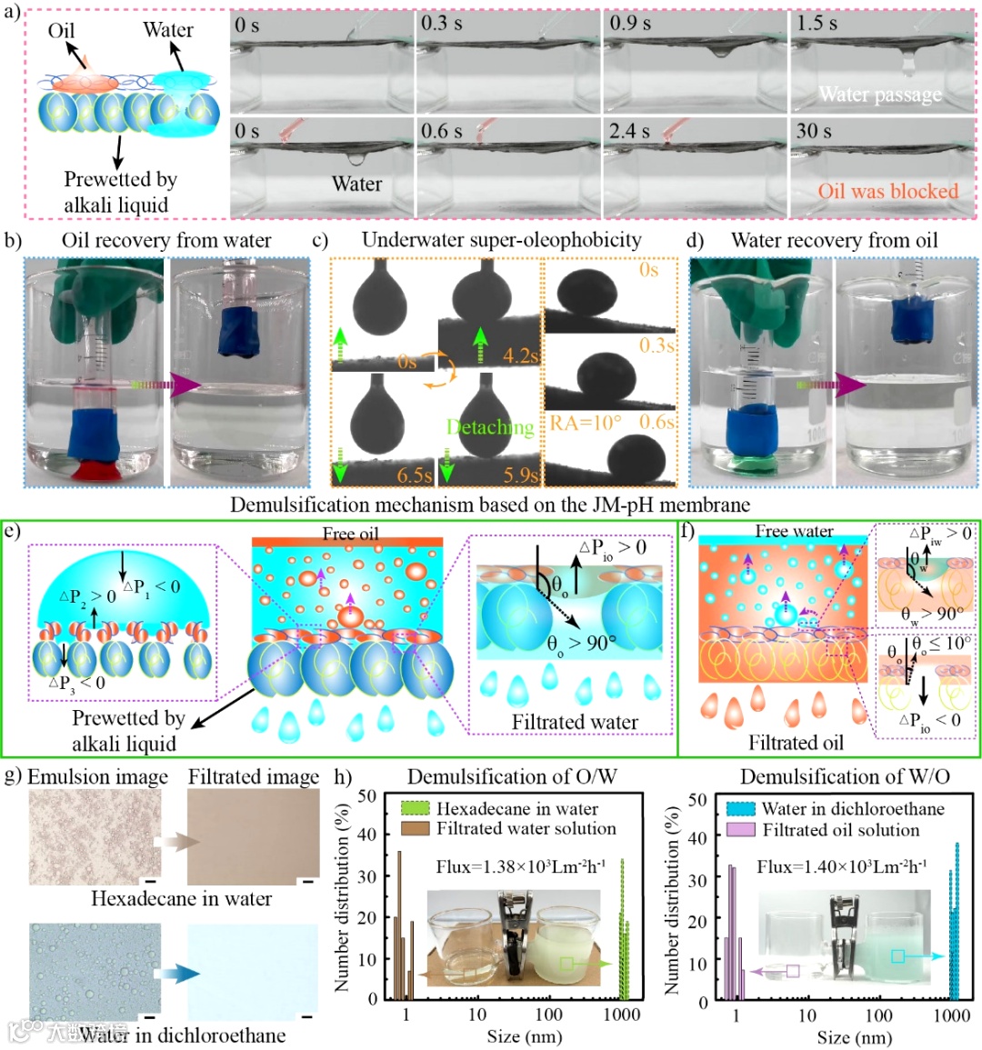 图6. a) 基于碱液预润湿JM-pH的水和油选择性单向运输示意图与实验。b) 利用JM-pH在水中回收油。c) 碱液预润湿PPFUA-grafted表面的水下超疏油性。d) 通过碱液预润湿JM-pH实现油中回收水;e) 基于JM-pH的O/W和W/O乳液的破乳机理。乳液过滤前后的显微照片g)和粒度分析h),乳液图像和过滤图像中的比例尺为20 μm。