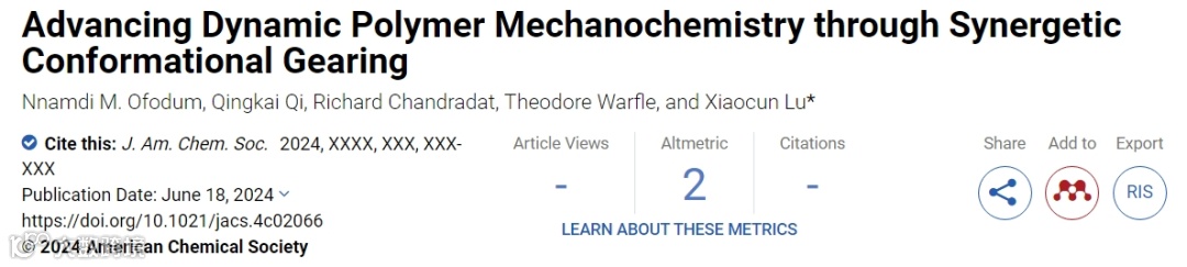 相关成果近期以“Advancing Dynamic Polymer Mechanochemistry through Synergetic Conformational Gearing”为标题发表在国际化学顶级期刊美国化学学会志(JACS)上。该研究成果的共同第一作者为美国克拉克森大学化学与生物分子科学系的Nnamdi M. Ofodum博士和祁清凯博士后,通讯作者为吕晓村(Xiaocun Lu)教授。