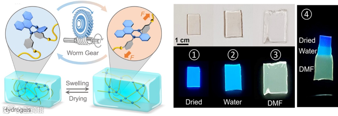 图1. mDPAC水凝胶通过溶剂溶胀和干燥双向可逆刺激来实现机械力致荧光变色性能