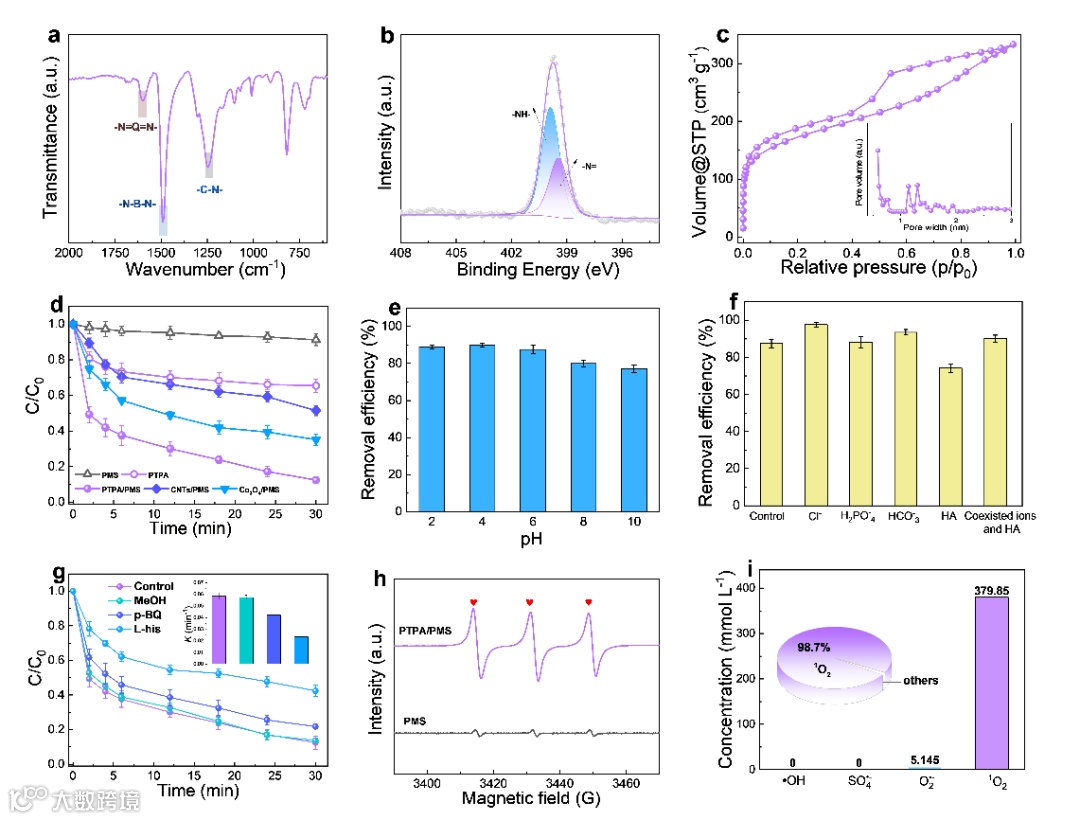 在动物组织内,淋巴管分支窦道系统内衬包含一层非连续的淋巴内皮细胞薄膜,形成具有反应器功能分层通道,发挥组织免疫监视功能。同时,这种细胞非连续性增加了薄膜的通透性,有利于捕捉间质成分和免疫细胞迁移。受淋巴内皮细胞薄膜启发,东华大学廖耀祖/吕伟团队制备了一种分级多孔有机催化膜,具有独特的分级多孔通道,可实现超高通量下水中微污染物的快速去除。该催化膜具体由共轭微孔聚合物(PTPA)催化剂活性薄层(1.7 mm)、PTPA颗粒堆积的介孔通道和电纺纳米纤维的大孔通道组成。活性薄层中PTPA固有微孔(0.58 nm),可埃米限域活化过硫酸盐(PMS)生成近乎100%的1O2,在降解有机微污染物的同时,有效避免了有机膜的自降解。实验研究和密度泛函理论计算结果分析,在埃级限域空间内,PMS发生了热力学上有利的自分解,即S-O键断裂并生成了1O2。分子动力学以及流体动力学模拟结果表明,生物启发的分层多级孔膜结构有利于实现高传质效率和高通量。因此,以双酚A为模拟污染物,该分级多孔有机催化膜可在超高通量下(2574 L m-2 h-1bar-1),持久地(120 h)、高效地催化降解性能(K = 1430.9 min-1,>95.0%的降解效率)。该催化膜在痕量新型有机微污染物的去除方面展示出了潜在的应用前景。同时,为高性能有机催化膜的构筑提供了新的设计思路。