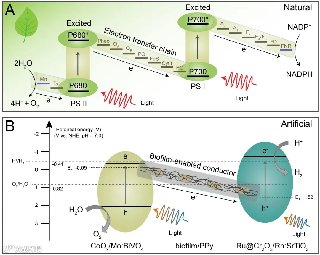 人工合成的半导体材料具备优异的可见光吸收能力,可以突破自然光合作用的效率限制。通过整合生物材料和无机半导体能够整合两种材料的优势,实现了光催化产氢、固碳、固氮等应用,然而目前高效、稳定、可持续的半人工Z-scheme体系仍然缺乏。