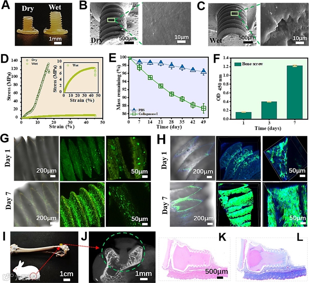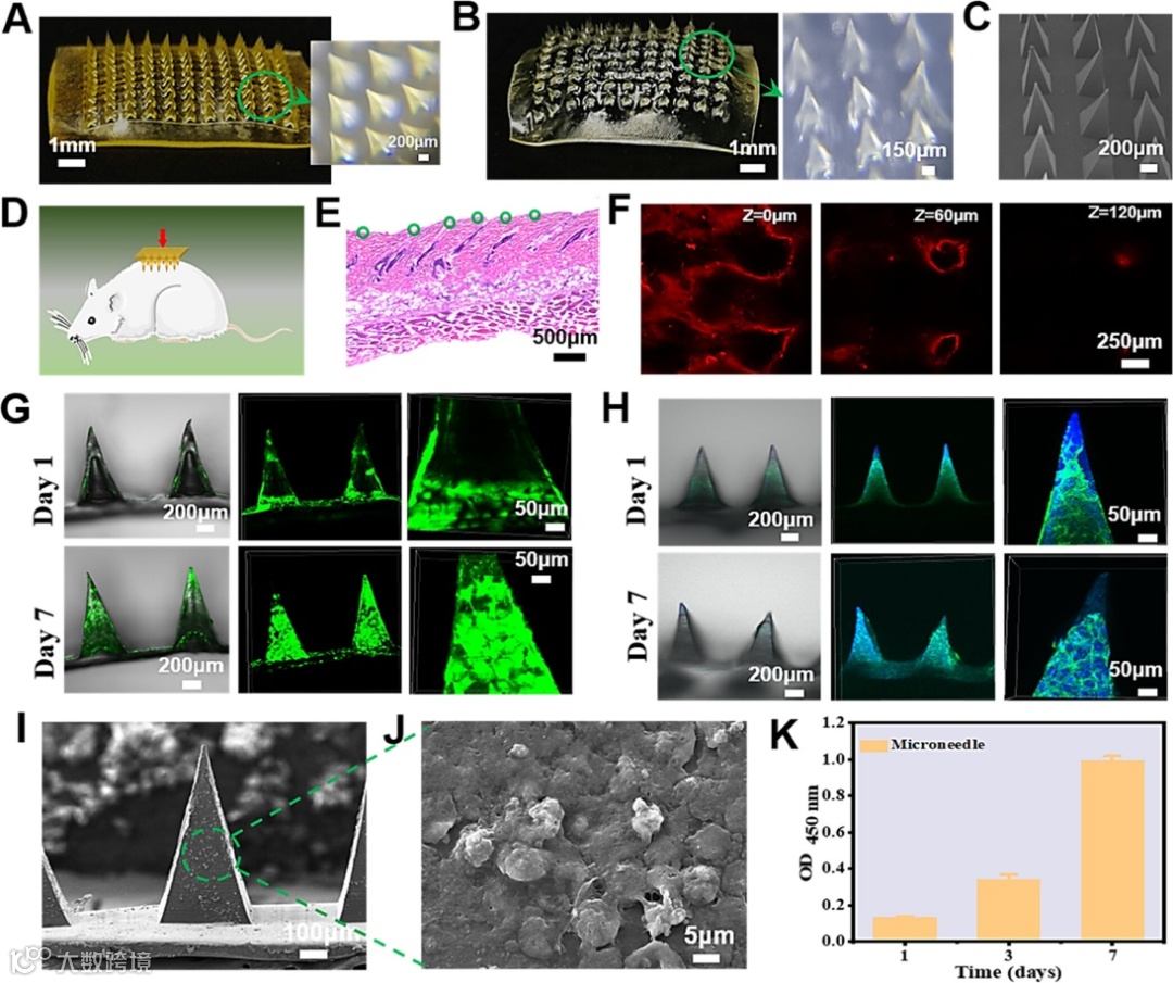 近期,武汉纺织大学张强教授团队从光合作用过程中汲取灵感,开发了一种简单的光交联技术,实现了优异机械性能蚕丝素蛋白水凝胶的高效制备,可在60秒内完成凝胶化(图1,2B)。核黄素和H2O2的联合使用实现了可持续的循环光交联反应,促进了从酪氨酸到二酪氨酸的转变,并最终形成高度交联的丝蛋白水凝胶;进一步,将该水凝胶进行包封脂肪间充质干细胞(ADSCs)研究其细胞相容性(图3A,B,C)和细胞干性维持作用(图3 D,E,F,G,H)。发现细胞培养过程中,水凝胶的二级结构向β折叠转变,硬度增加。细胞干性的保持可能归功于水凝胶硬度的增加,这一发现对于负载干细胞的丝素水凝胶的临床应用具有重要意义。这项研究工作突破了传统丝素水凝胶在组织工程上力学性能不足的技术瓶颈,同时为干细胞治疗临床应用提供了新思路。同时,由于该丝素水凝胶表现出了优良的可加工性,可以方便地加工成骨钉(图4)、微针(图5)等形式,在医疗微器件和装置方面显示了极大的应用潜力。该工作以“Superb Silk Hydrogels with High Adaptability, Bioactivity, and Versatility Enabled by Photo-Cross-Linking”为题发表在《ACS Nano》上(DOI:10.1021/acsnano.4c05017)。文章第一作者是武汉纺织大学纺织科学与工程学院研究生黄仁艳。