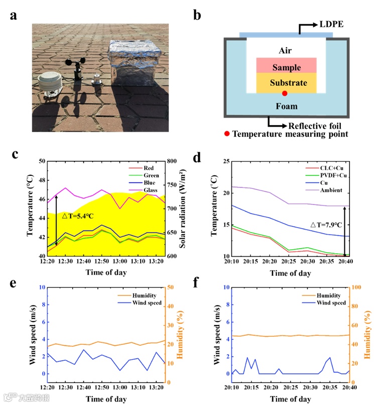 图4. PSCLC薄膜的被动辐射冷却性能。a)位于中国天津平坦开阔区域的实验装置图;b)测试冷却性能的实验装置示意图;c)和d)白天和夜晚户外实验的实时温度数据;e)和f) 天津市的实时风速和相对湿度。