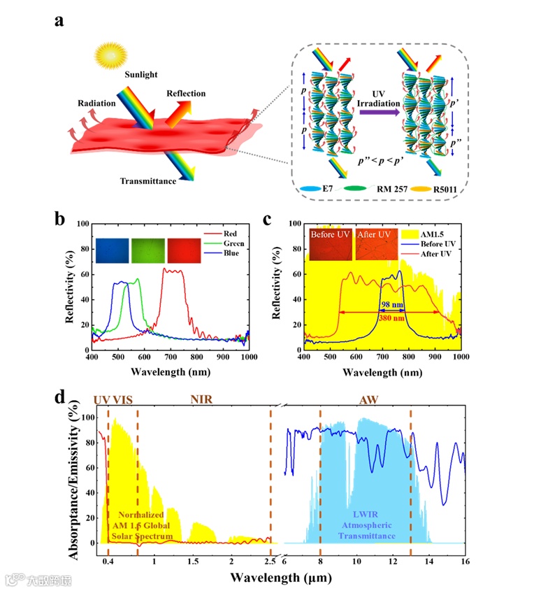 图1. PRC PSCLC膜的理论分析和光学特性。a)PRC PSCLC薄膜的结构和功能示意图,能够选择性地反射太阳光,通过大气窗口有效发射红外光,优异的紫外吸收能力;b)蓝色、绿色和红色PSCLC薄膜的反射光谱,插图是偏振光学显微镜下对应的织构图;c)紫外光聚合前后PSCLC薄膜的反射光谱;d)50μm PRC PSCLC膜在紫外-可见-红外范围内的吸收/发射光谱。