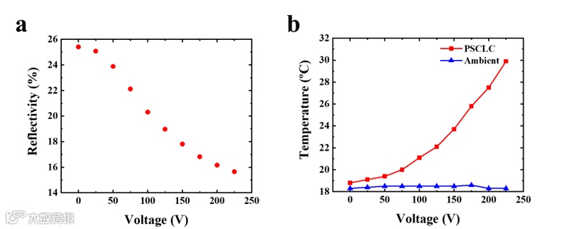 图6. PSCLC薄膜在电控制下的光学性能和温度。a)PSCLC薄膜在不同电压下的反射性能;b)PSCLC薄膜在不同电压下的表面温度。