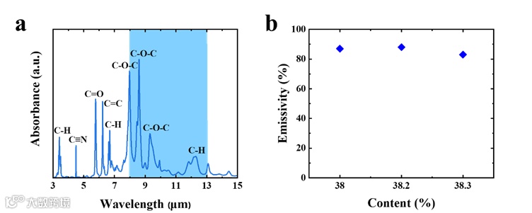 图2. PSCLC薄膜在大气透明窗口内的辐射特性。a)PSCLC薄膜的吸收光谱。b)具有不同C-O-C含量的PSCLC薄膜的发射率。