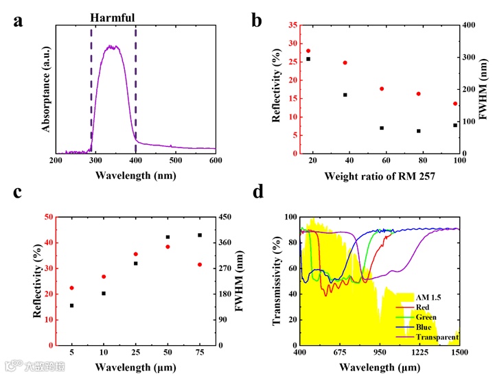 图3. PSCLC膜在太阳光波长范围内的反射特性。a)UV-320的吸收光谱;b)不同RM257含量的PSCLC薄膜(从17.55%到97.55%)的反射率和FWHM;c)不同厚度的PSCLC薄膜(从5到75μm)的反射率和FWHM;d)蓝色、绿色、红色和透明的PSCLC薄膜的透射光谱。