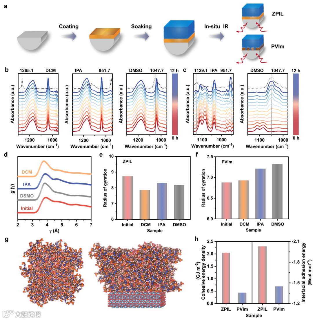 后续使用了原位ATR-IR装置对溶剂向ZPIL材料的扩散进行了实验表征分析。对于ZPIL,即使在DCM、IPA、DMSO等多种有机溶剂中浸泡长达12 h,也未能在单晶硅表面检测到相应溶剂的存在(图5b)。对于能够溶解PVIm的IPA和 DMSO这两种有机溶剂,在分别浸泡9 h和5 h时也在ATR-IR光谱中发现了相应的溶剂出峰(图4c)。