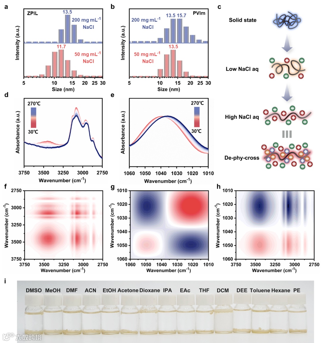 在外加少量溶剂H2O的情况下,H2O与ZPIL之间的相互作用极强,甚至足以部分破坏ZPIL材料内部的静电交联结构,增大主链间距,从而提升聚合物链段的运动能力(图3a)。只有在大量外加H2O溶剂情况下,ZPIL体系中能够以缔合形式存在的 H2O达到饱和时才会有游离状态的自由水出现(图3c)。H2O能够显著调节 ZPIL内部的阴阳离子间作用力,部分破坏材料因静电偶极-偶极相互作用形成的动态交联结构,使得ZPIL材料的宏观状态表现为可加工的流动状态。