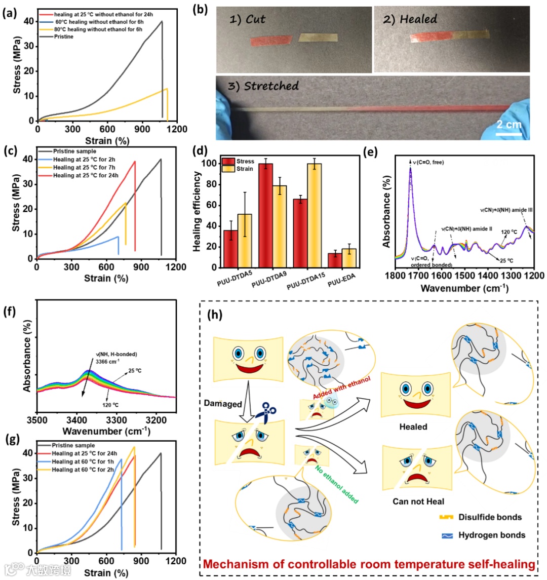 图4 (a) PUU-DTDA9在不同温度下无乙醇辅助修复后的应力-应变曲线,(b) PUU-DTDA9修复前后的数码照片,(c) PUU-DTDA9在乙醇辅助下室温修复不同时间后的应力-应变曲线,(d) 具有氢键和二硫键含量的PUU弹性体的修复效率,(e, f) PUU-DTDA9变温红外光谱,(g) PUU-DTDA9在乙醇的辅助下在不同温度下愈合后的应力-应变曲线,(h) PUU-DTDA9弹性体可能的修复机理