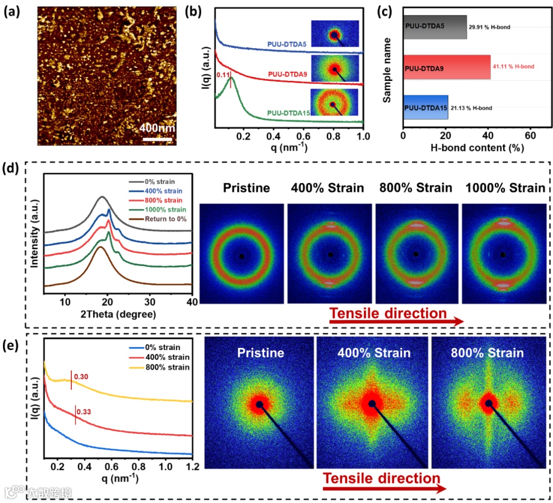 图3 (a) PUU-DTDA9的AFM相图,(b) PUU-DTDA的SAXS图,(c) PUU-DTDA的氢键含量,(d) PUU-DTDA9在0%至1000%应变下的1D和2D WAXS图,(e) PUU-DTDA9在0%至800%应变下的1D和2D SAXS图