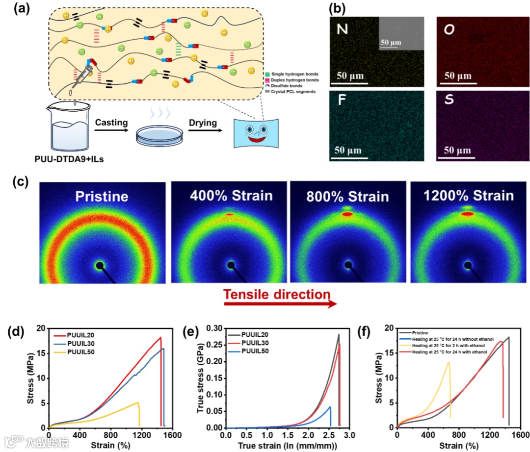 图5 (a) 离子皮肤的构筑示意图,(b) 离子皮肤表面的元素分布,(c) 离子皮肤在拉伸过程中的2D WAXS图,(d) 不同离子液体含量离子皮肤的应力-应变曲线,(e) 不同离子液体含量离子皮肤的真实应力-应变曲线,(f) 离子皮肤的室温修复性能