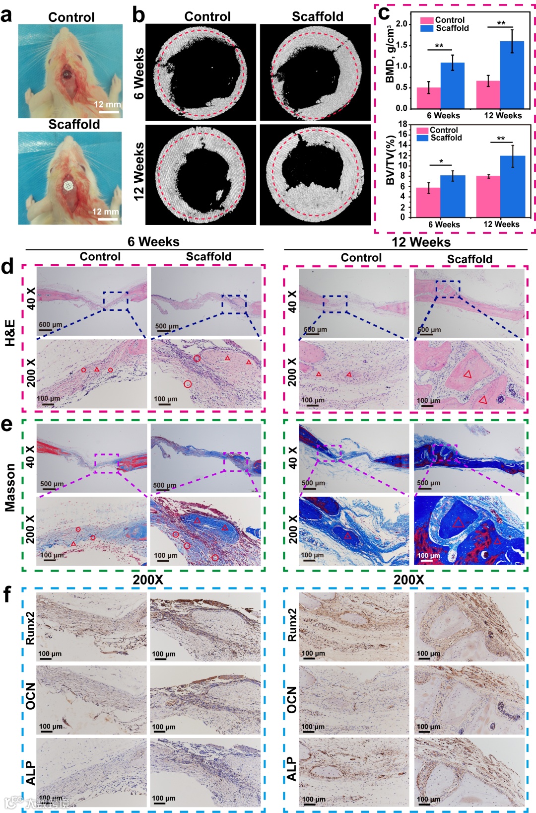 为了验证SA/HNTs陶瓷支架体内骨缺损的修复能力,将陶瓷支架植入大鼠颅骨缺损处,图6a是大鼠颅骨修复的对照组和植入SA/HNTs陶瓷支架组植入图。6和12周后,通过Micro-CT评估SA/HNTs陶瓷支架在体内骨缺损的修复能力,结果表明在手术后空白组和支架组均有新骨生成,其中支架组新生骨生成面积大于空白组(图6b)。大鼠颅骨缺损部位的骨密度(BMD)和BV/TV的定量分析结果也证明了支架组新生骨优于对照组(图6c)。将SA/HNTs陶瓷支架植入6和12周后,通过HE和Masson染色在骨-植入物界面处评估新骨形成情况。HE染色情况如图6d所示,在第6周,与对照组相比,SA/HNTs陶瓷支架组有更厚的基质生成,有较多的新生血管和新生骨出现,而对照组颅骨缺损部位只有少量的组织纤维填充,仅有少量的新生骨和血管生成。在第12周,SA/HNTs陶瓷支架组在缺损处与对照组比有更多的新骨形成。Masson染色与HE染色结论一致(图6e),在第6周,对照组颅骨缺损处仅有少量的蓝色的胶原纤维填充,无明显新生骨形成,而SA/HNTs陶瓷支架组颅骨缺损处被大量蓝色的胶原纤维填充,沉积的胶原纤维层较厚,排列更加致密,有较多的新生血管和新生骨生成。在第12周,与对照组比,SA/HNTs陶瓷支架组在缺损处同样地有更多的新骨形成。为了进一步验证SA/HNTs陶瓷支架的促成骨效果,利用免疫组织化学染色观察手术6和12周后大鼠颅骨中的Runx2、OCN和ALP三种蛋白的表达情况。由图6f可知,对照组在颅骨缺损部位的细胞仅有少量Runx2、OCN和ALP的阳性表达。而对于SA/HNTs陶瓷支架组颅骨缺损部位周围可见更多的阳性表达,表明SA/HNTs陶瓷支架组能促进颅骨损伤部位细胞表达Runx2、OCN和ALP,从而促进颅骨缺损的修复。