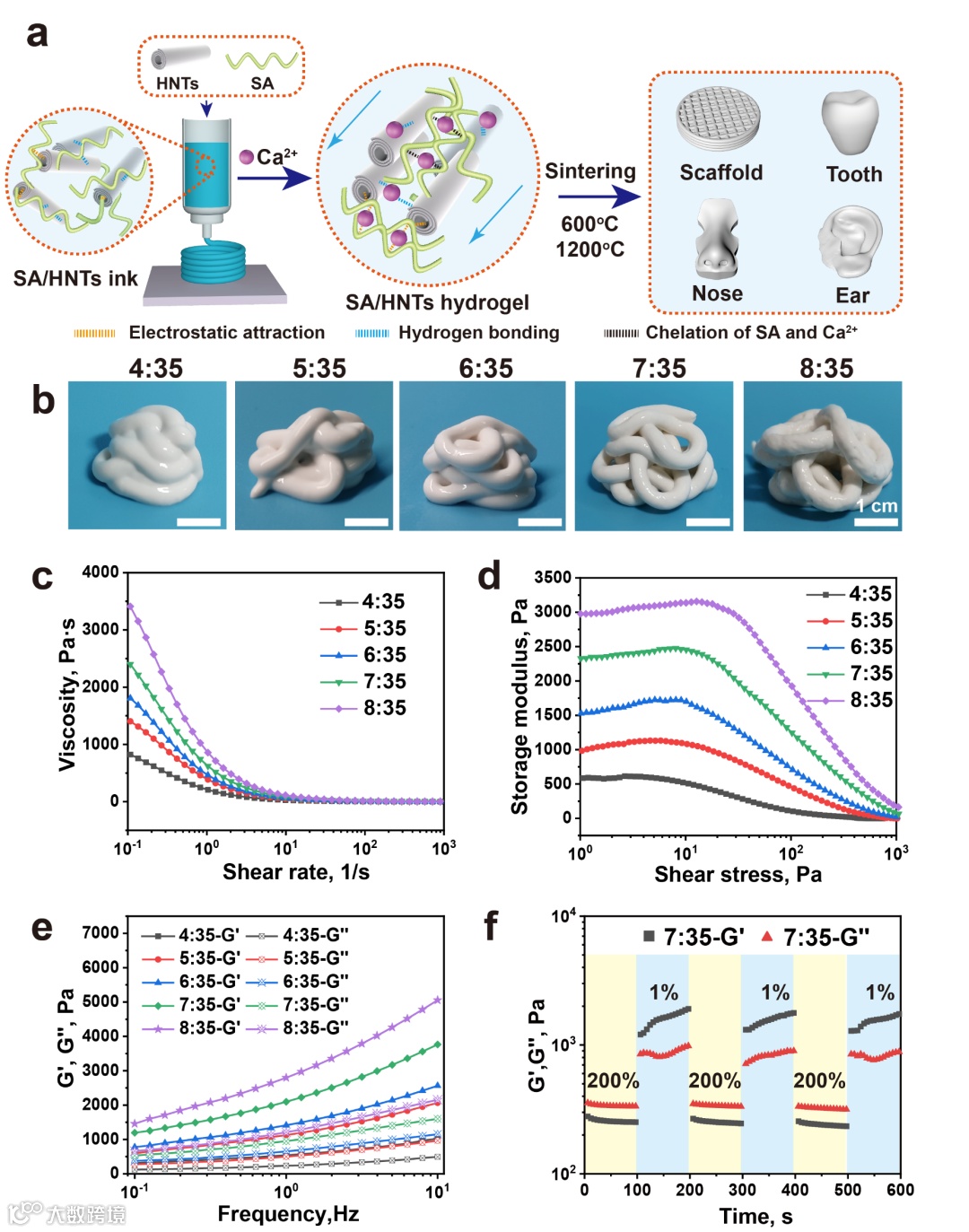 本工作采用实验室自行改装的商业3D打印机。如图1a所示,SA和HNT混合得到SA/HNT油墨。将设计好的模型用3D打印机打印完成后,用CaCl2将其转化为水凝胶,得到SA/HNTs水凝胶。最后,对水凝胶进行高温烧结,得到SA/HNTs陶瓷。合适的粘度是墨水可打印性和成型性的关键。图1b中,当SA的浓度增加,SA/HNTs的复合材料逐渐从液体转变为可成型性,但是当SA的浓度增加到8%时,墨水出现干皱的情况。另外,如图1c和图1d所示,为了保证墨水能从微小的针头顺利挤出,评测了不同比例的SA/HNTs墨水的剪切变稀和剪切屈服特性。结果表明,SA/HNTs墨水随着SA的浓度从低到高(4-8%),同样表现出典型的剪切变稀和剪切屈服特性。在图1c中,在剪切速率0.1 s-1时,随着SA浓度从4%增加到8%,墨水粘度从823.7 Pa·s增加到3410.4 Pa·s;在图1d中,当剪切应力1 Pa时,随着SA浓度从4%增加到8%,G’从586.5 Pa增加到2976.4 Pa,这表明随SA含量增加,SA与HNTs形成了更强的相互作用网络结构。另外,当剪切速率从0.1 s-1增加到103 s-1,剪切应力从1 Pa增加至103 Pa时,SA/HNTs墨水所有比例的粘度急剧下降几个数量级,这说明在剪切速率和剪切应力增加时SA/HNTs墨水都表现出剪切稀化和剪切屈服特性。此外,对SA/HNTs的粘弹性也进行了测试。如图1e,在振荡频率扫描测试中,当SA的浓度从4%增加到8%时,SA/HNTs墨水的G’和G’’都明显增加,不过SA/HNTs墨水都仍具有类固体性质(G’>G’’)。因此,结合材料的粘弹性、剪切变稀和剪切屈服特性,选择7:35的SA/HNTs墨水作为3D打印模型的浓度。