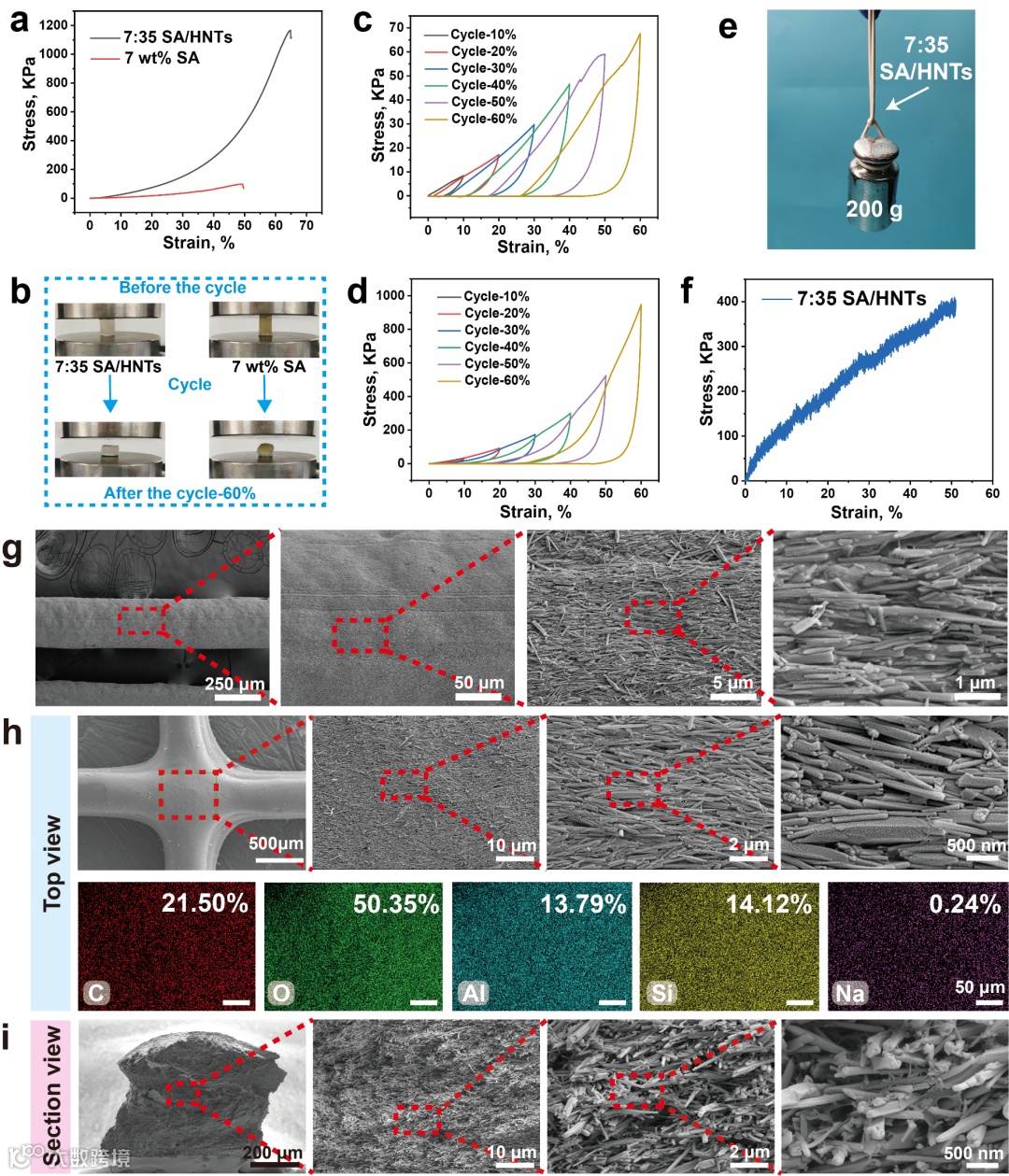 图3 SA/HNT水凝胶的力学性能和扫描电镜。水凝胶的压缩应力-应变曲线(a);不同压缩循环下,7 wt% SA (c)和SA/HNT水凝胶(d)的压缩特性 (b) 和压缩应力-应变曲线。在SA/HNTs水凝胶的细丝(直径为2mm)上悬挂200 g的重量(e);纱线细丝的拉伸应力-应变曲线(f);SA/HNTs水凝胶的细丝(直径为0.26 mm)的SEM照片(g);水凝胶在不同放大倍数下的SEM图像(俯视图)及其元素分布图 (h)以及剖面图(i)