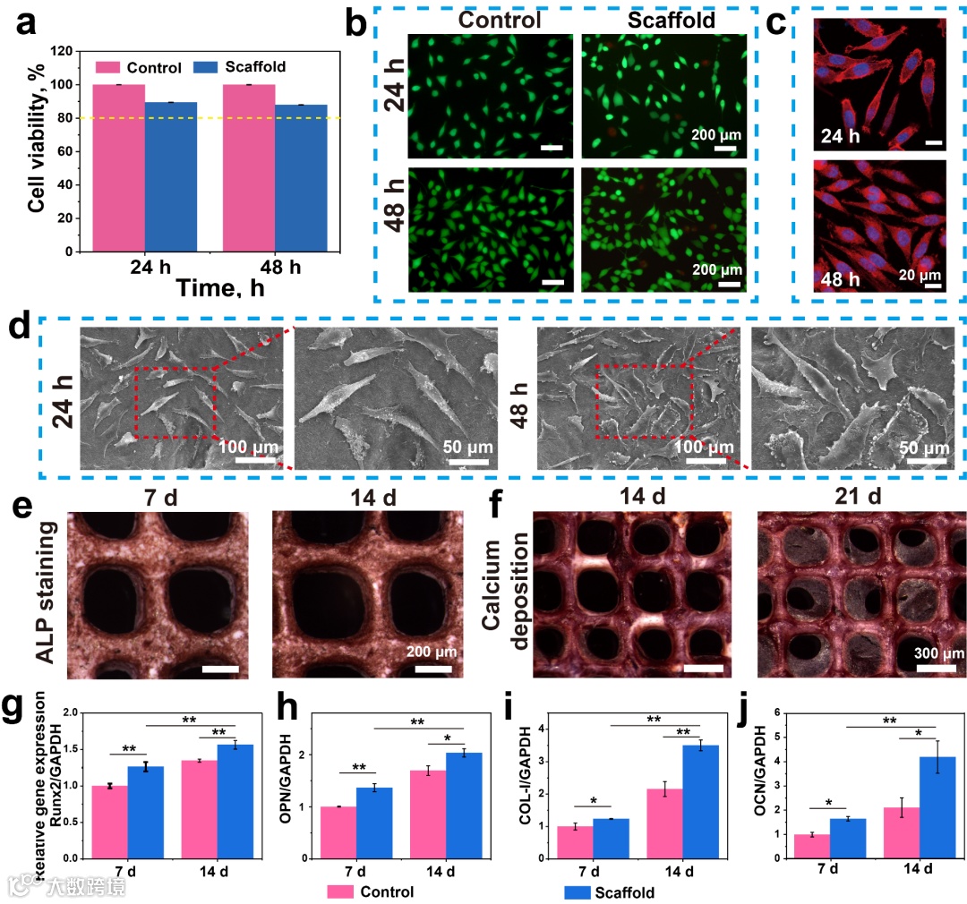 图5 SA/HNT陶瓷支架的生物相容性研究SA/HNT陶瓷支架上培养24和48小时的骨髓间充质干细胞细胞活力(a)、荧光染色图像(b)、LSCM图像(c)和SEM图像(d);SA/HNT陶瓷支架上培养的骨髓间充质干细胞的ALP (e)和茜素红(f)染色。SA/HNT陶瓷支架培养7、14 d时,Runx2 (g)、OPN (h)、CoL-I (i)、OCN (j)的相对基因表达量(*P< 0.05,**P< 0.01)