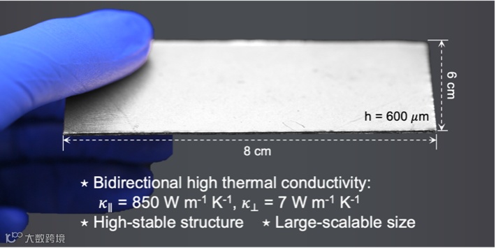 与其他高导热材料相比,GTF-SBA热通量高,传热能力优异,此外,其面内热导率随厚度的衰减缓慢,且具有较高的面外导热系数,是一种轻质且双向高导热的材料,有望实现电子器件的高效散热,并为高性能石墨烯基材料在极端热管理领域指明了未来发展方向(图5a-g)。