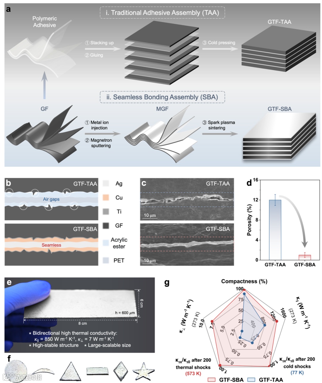 相比于传统聚合物胶粘接制备的石墨烯基厚膜(GTF-TAA),该工作采用无缝键合组装策略(SBA),通过设计金属纳米层的成分和石墨烯/金属界面的微观结构,有效消除了GTF的内部孔隙,构建了无缝牢固的界面,实现了GTF的双向高导热性和在极端条件下的结构超稳定性(图1a-d)。此外,由于SBA策略的高效和可扩展性,GTF-SBA的厚度、尺寸和形状可容易调控,为不规则热管理组件的要求提供了新的技术解决方案(图1e-g)。