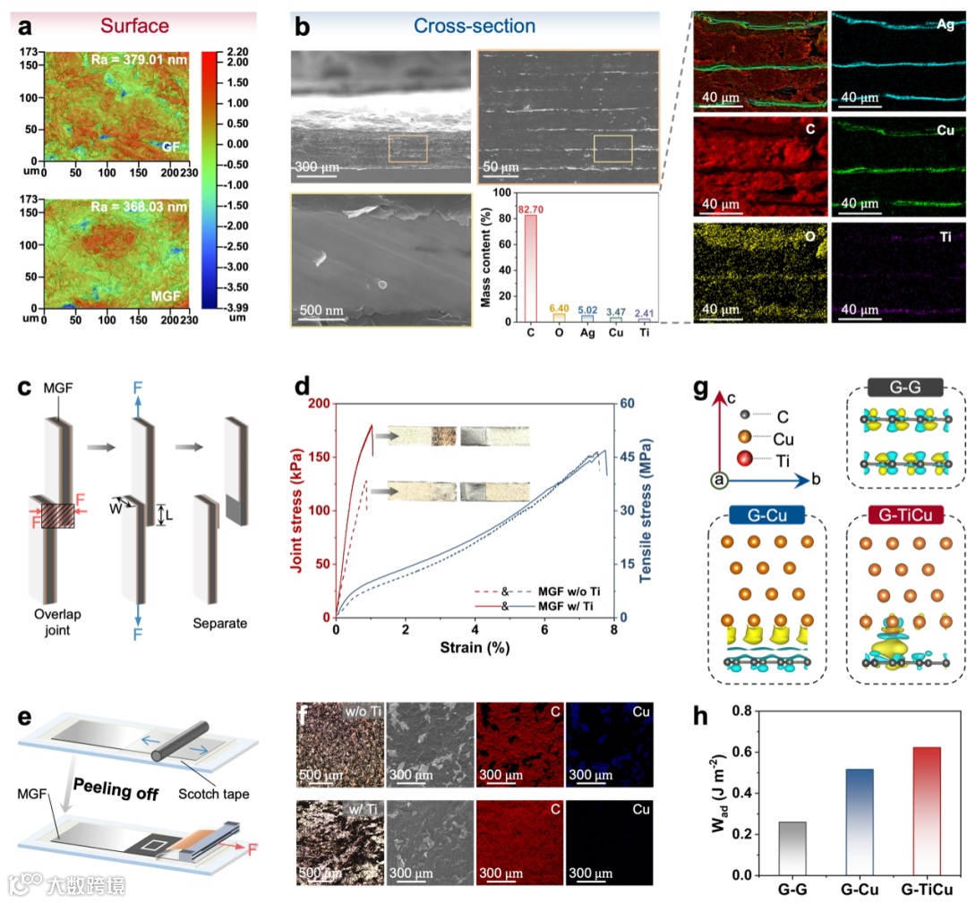 图2 (a)GF和MGF的表面粗糙度。(b)GTF-SBA的断面SEM图像及相应的C、O、Ag、Cu、Ti元素映射图。(c)搭接剪切测试的示意图。(d)不含Ti和含Ti的MGF的剪切应力-应变曲线及拉伸应力-应变曲线。插图是剪切破坏后MGF的光学图像。(e)MGF的剥离测试示意图。(f)用3M透明胶带剥离后的MGF的光学图像和SEM图像。(g)石墨烯/石墨烯、石墨烯/Cu和石墨烯/TiCu界面的差分电荷密度分布的DFT计算。(h)三种界面结构的黏附功。黄色电子云表示电荷的积累,蓝色表示消耗。