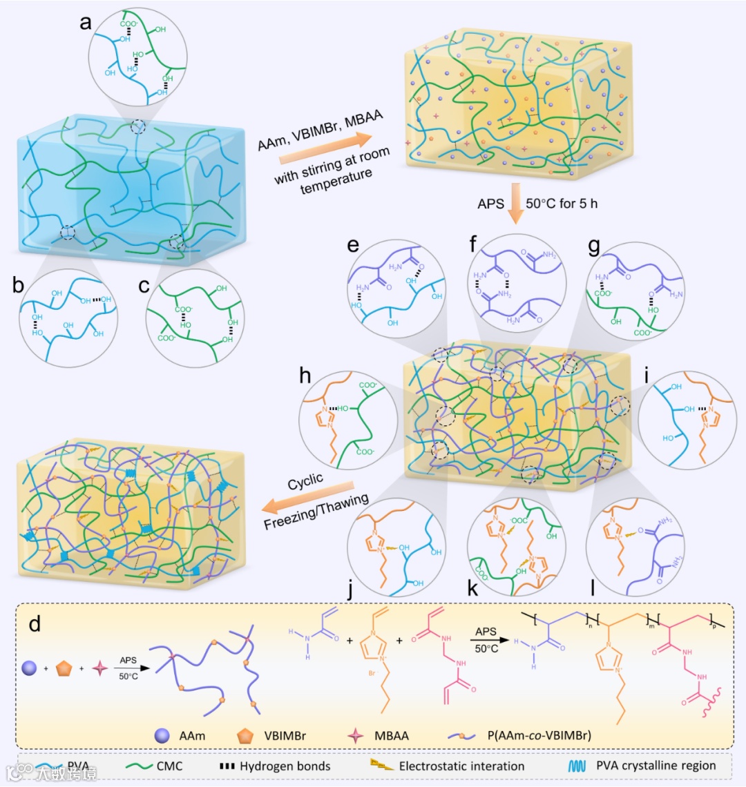 图1. PCPAV水凝胶的合成机理以及交联相互作用。