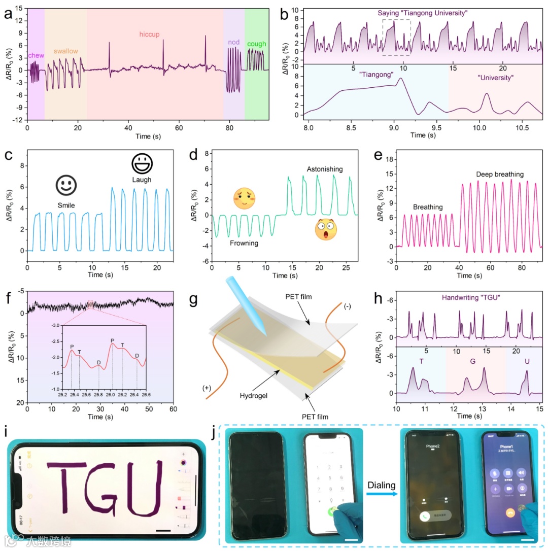 将水凝胶组装成传感器,它可以检测人体不同关节的运动,并且在低温下同样能够输出稳定的电信号(图6)。此外,它还可以检测声带振动、面部表情等微小肌肉运动。特别是,可以检测到脉搏的跳动。此外,它还可以作为书写板应用于防伪和保密设备中,水凝胶还可以用作电子笔拨打电话,表明其在人机交互领域中的应用潜力(图7)。