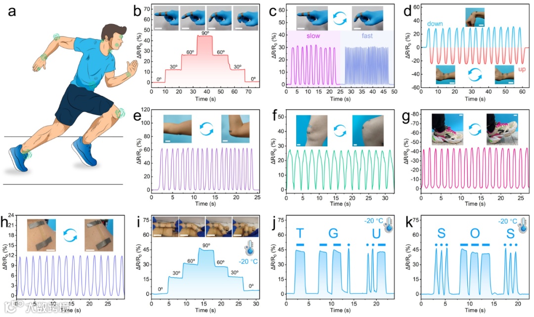图6. PCPAV水凝胶应变传感器监测大尺度关节运动