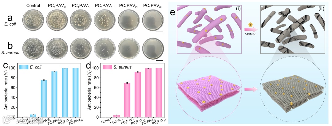 如图4所示, PCPAV水凝胶对大肠杆菌和金黄色葡萄球菌的抗菌效果均随着VBIMBr含量的增加而明显增强。PCPAV水凝胶的抗菌活性这可归因于两个方面,一方面,VBIMBr中咪唑阳离子的正电荷与细菌细胞膜中的磷酸基团之间存在静电相互作用,导致VBIMBr优先吸附在细胞膜上。另一方面,VBIMBr末端烷基链会插入细胞膜的亲脂区域,引起细胞膜穿孔,造成不可逆的物理损伤,最终导致细菌死亡,从而达到抗菌的目的。