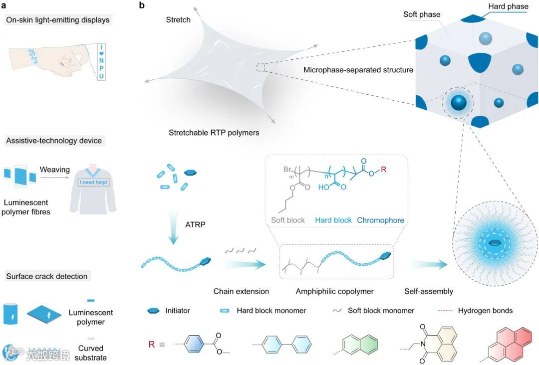 此外,通过改变引发剂的结构和组分,研究人员制备了具有全彩磷光发射的柔性聚合物材料。基于材料多彩、柔性、可拉伸以及易加工等特性,初步探索了材料在信息存储、大面积柔性显示等领域的潜在应用(图4)。以上研究结果不仅解决了本领域所面临的挑战,实现了磷光聚合物的柔性化,同时为开发适用于柔性显示、可穿戴设备以及智能电子皮肤等领域的柔性发光材料提供了理论指导,推动了柔性发光材料的发展。这一工作得到了国家自然科学基金、广东省基础与应用基础研究基金和浙江省自然科学基金等项目的支持。相关成果以“Stretchable phosphorescent polymers by multiphase engineering”为题发表在高水平学术期刊——Nature Communications(《自然·通讯》)上,西北工业大学柔性电子研究院博士生甘楠为本文第一作者。